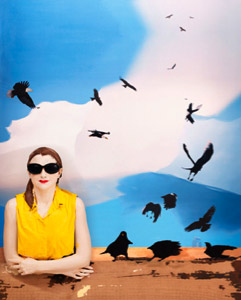Also on view at BravinLee Programs is Boo Ritson‘s exhibition, All Aboard. Defying simple categorization, Ritson’s work straddles the realms of painting, sculpture, performance and photography. Ritson conceives a character and costumes the model/sitter. She then paints directly on the sitter’s exposed skin and costume before documenting the result photographically. The exhibition includes two works that are part of a new thread of work in which Ritson uses the popular Lookie-loo motif, in which a sitter places his head in a hole cut atop a painted figure scene backdrop.